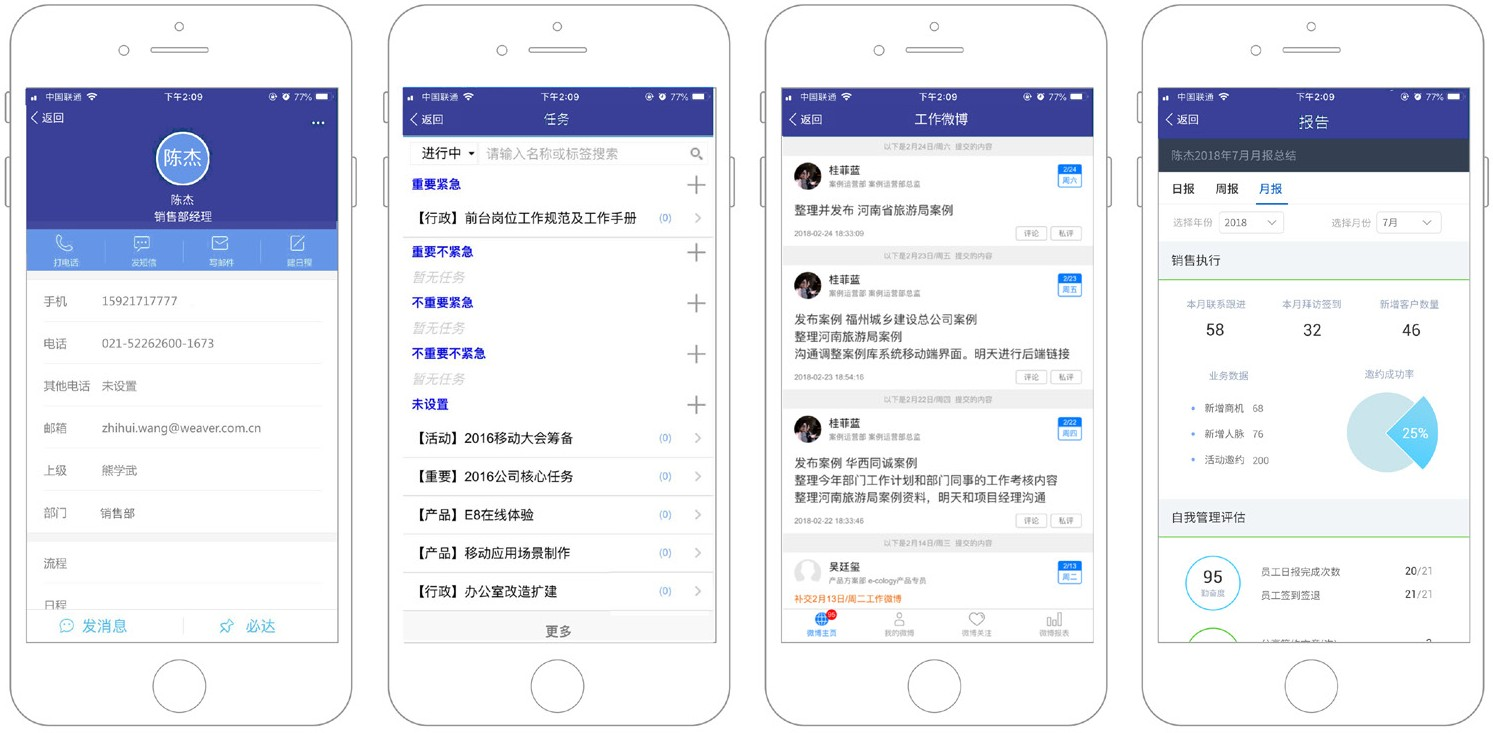 把企业经营中的各种目标、任务、计划、报告管理移植到手机移动端,方便用户对自己的工作进行管理和汇报,同时方便管理层随时了解每一个员工的工作状态和工作成效。