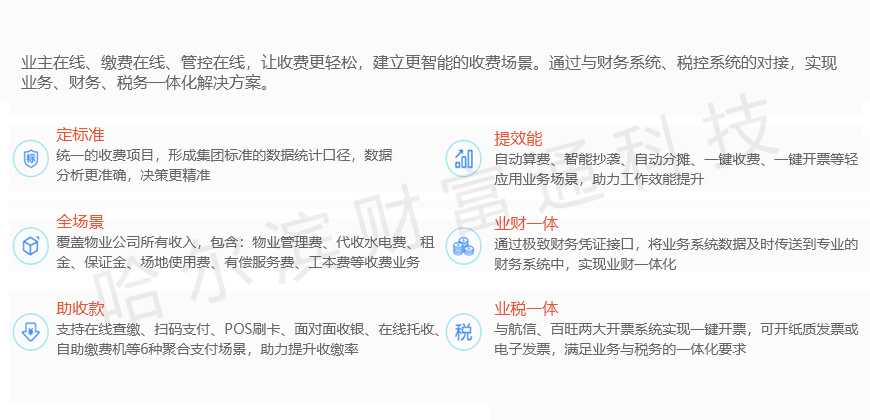 物业费、卫生费、车位管理费、水电费等都集中在一个平台管理;物业人员可根据不同的房屋类型、配套设施、缴费项目自定义设置不同的缴费规则,为物业提供便捷的差异化收费服务,同时业主在手机APP即可查看计费规则,公开透明,提高业主对物业的信任度,平台自动生成费用报表,由物业统一收账和管理。