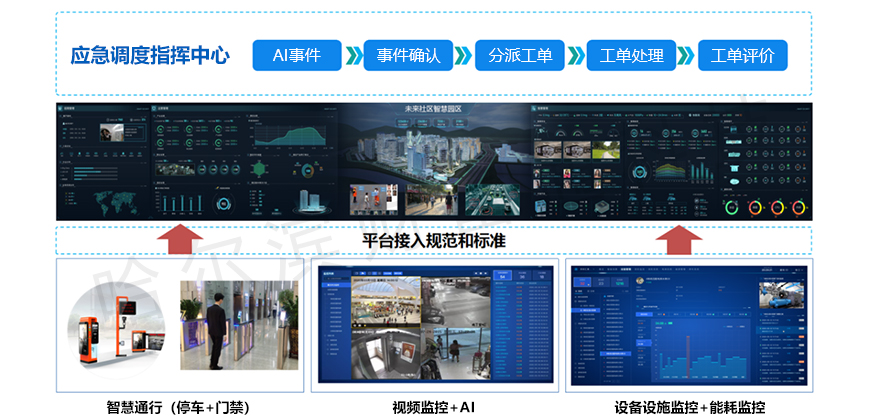 对物业安防能力和状态进行综合管控:集成视频监控、视频周界、视频巡更、智慧消防、机物业工作人员巡更巡检等设备和系统,进行统一管理和集中展示和安全宣传,并设定不同应急保障预案,有效保障物业管理范围内的安全防控。