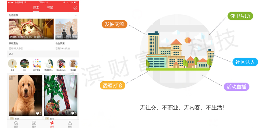 通过小程序推送天气预警,特定场所推送差异化信息到适宜人群,对区域未来停水停电计划进行推送,对突发事件及区域群体事件进行预警;建设邻里互动模块,方便居民交流互动,主要有租赁求租、跳蚤市场、育儿育婴以及养宠心得交流,增进邻里之间的交流减少矛盾冲突的发生,减轻物业的调解工作压力。